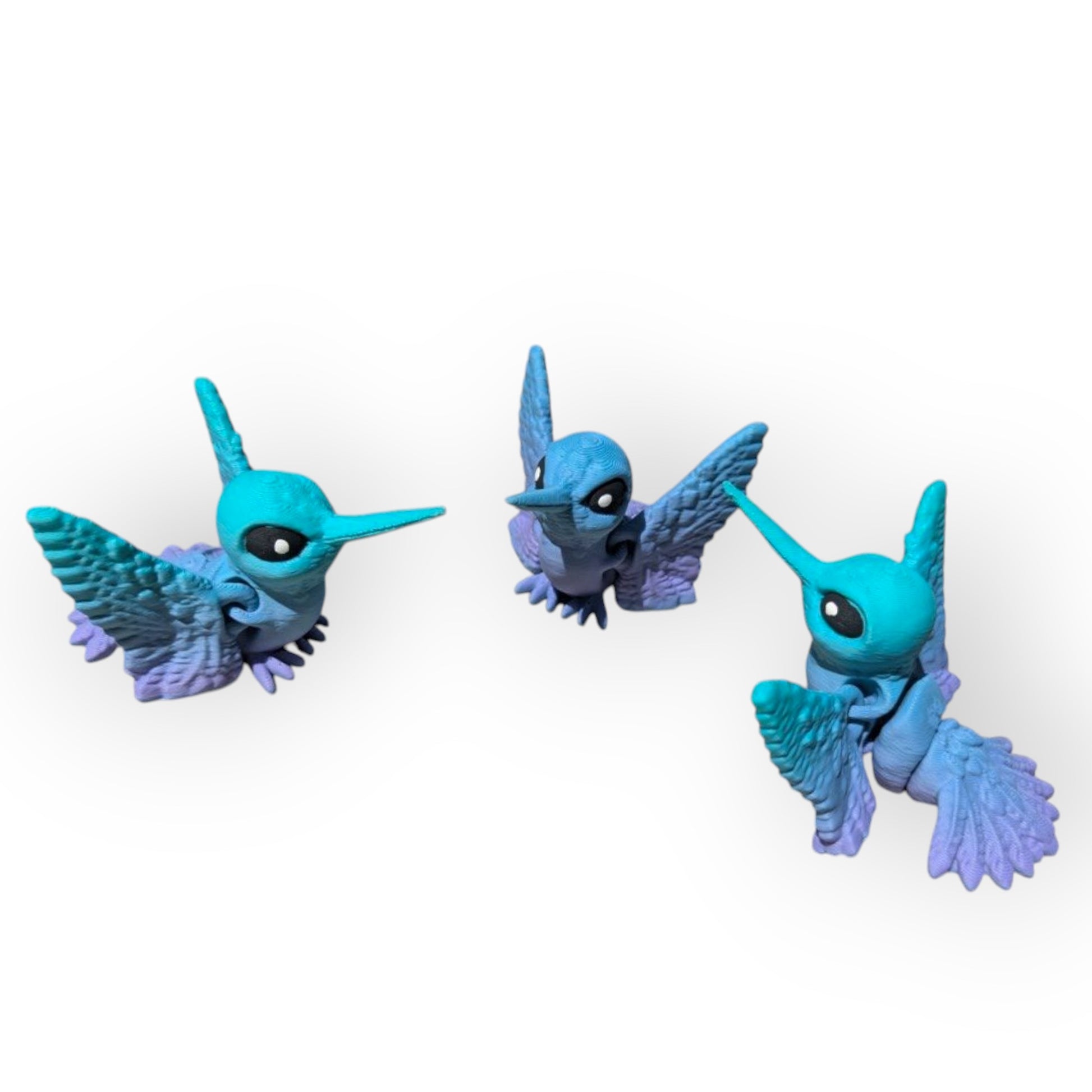 3D printed hummingbirds have a sharp beak and elaborate feather details. Printed in a random mermaid gradient green-blue-purple color.